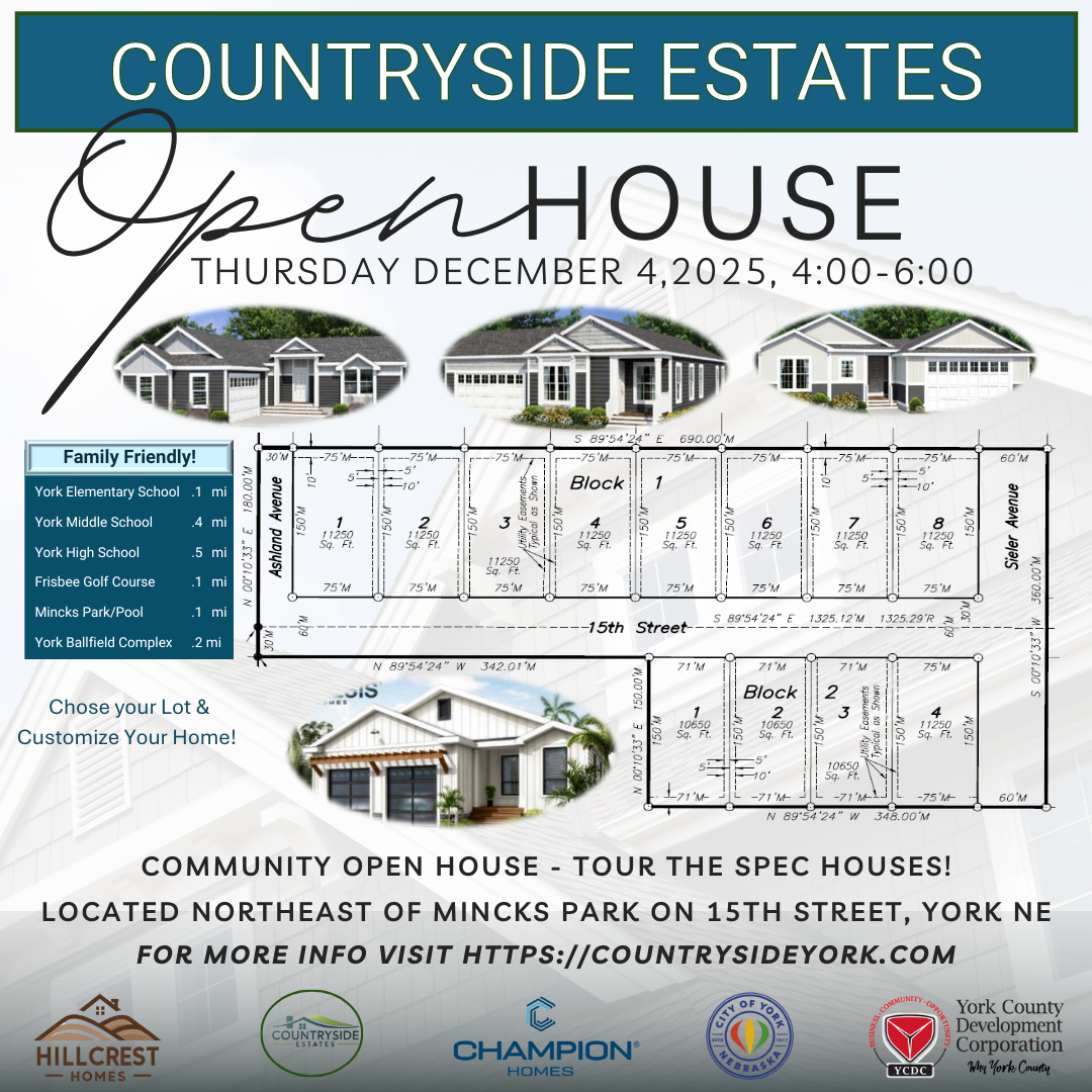 York County residents, businesses, and prospective homeowners are invited to tour new housing options at the Countryside Estates Open House on Thursday, December 4, 2025, from 4:00–6:00 p.m with a ribbon cutting at 4:15. This family-friendly event will showcase recently completed spec homes, available lots, and opportunities to customize a future home in one of York’s growing neighborhoods.